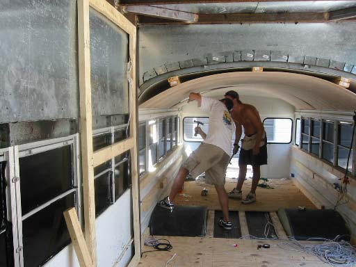 Installing parts of the ceiling. Matt is showing Dustin the proper technique for nailing in the molding.